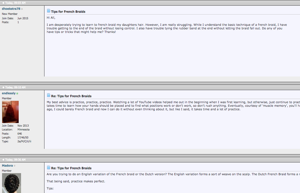 My biggest challenge has been getting answers to my questions. I am not the most patient person so when I have questions on a particular step or process, it has been hard to wait for an answer (many of which never came). I have posted in chat forums and also in the comments section under YouTube videos. While no one has replied on YouTube, I have received pretty good feedback from The Long Hair Community. However, this type of communication is a fairly slow way to interact and attempt dialogue. I think it just takes getting used to. Be be honest, I thought about having my wife log on a forum so I could ask her questions indirectly but I decided that this was basically cheating. Also, I believe that she is enjoying watching me struggle with this task so I’m not expecting her to give much advice! Although receiving answers to all my questions would be nice, much of the time I have answered my own questions as I continued to practice and figure things out on my own. I also realized that often my questions were already asked and answered by others on these sites. Once I realized this, I then began to scan the comments section after watching each YouTube video.