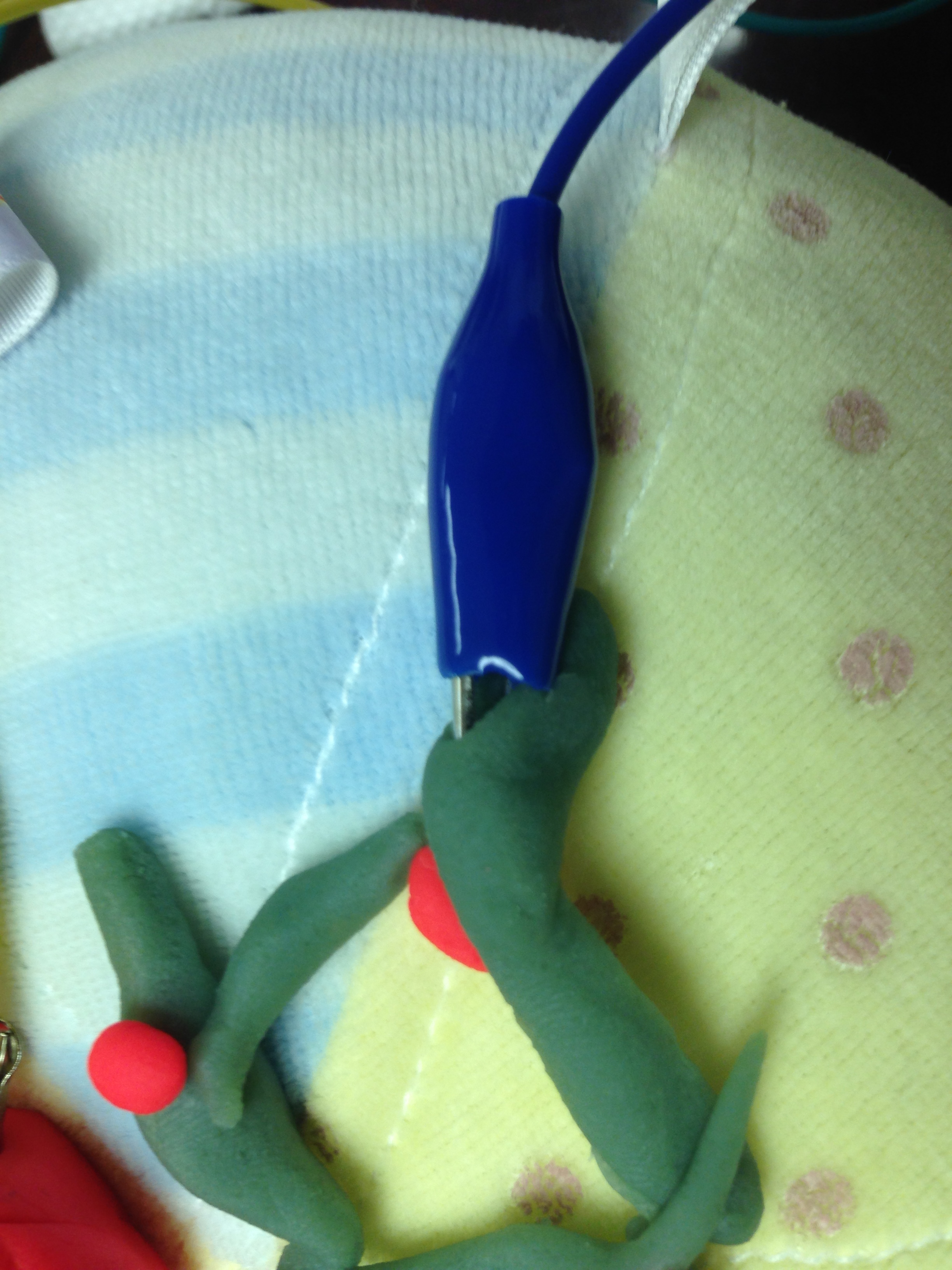 STEP 9: Make a round ball of Play-Doh (or whatever else you want) to represent the full cell image on slide 1. Connect this to the alligator clip in input #1.