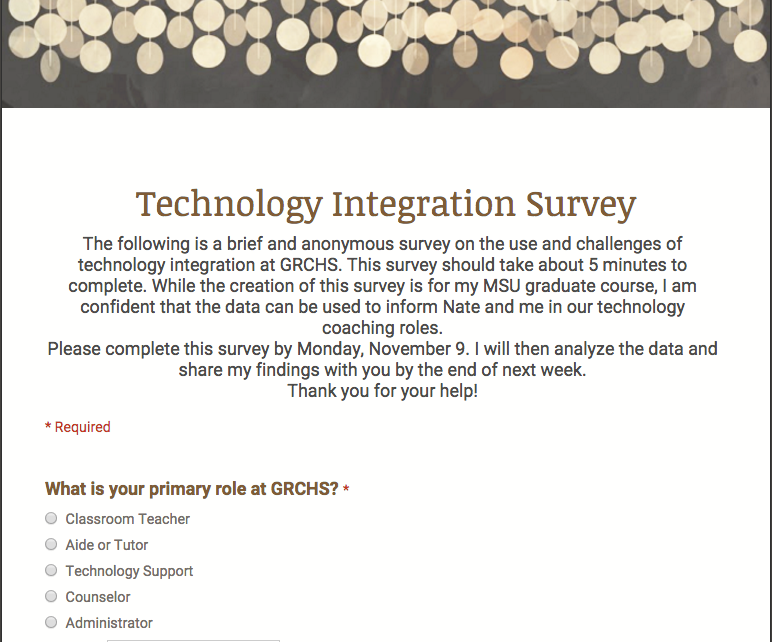 In my new role as a technology coach, I thought it would be a good idea to take the pulse of my co-workers. Therefore, I designed a technology integration survey with two main goals in mind.